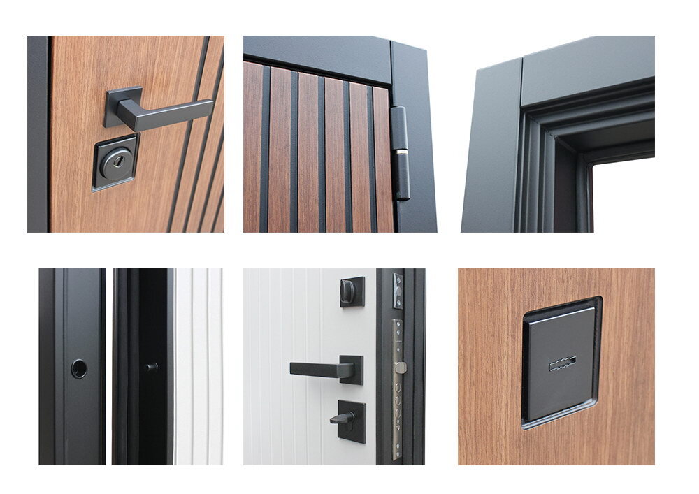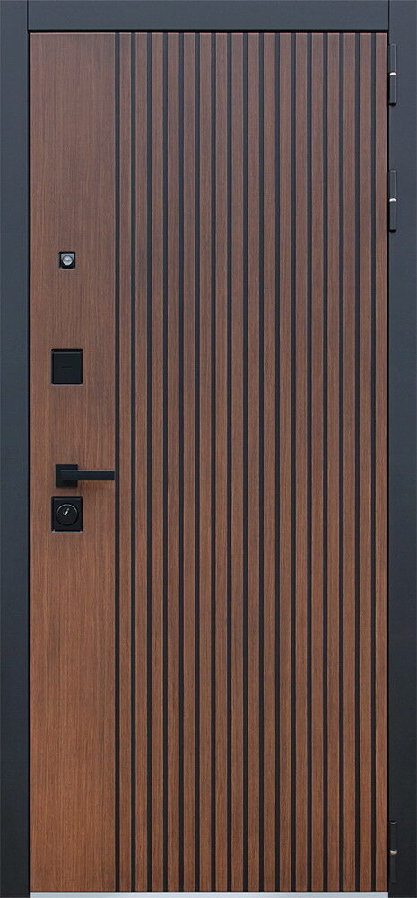 Лист металла 1,5 мм. Экошпонированная дизайнерская панель МДФ 10 мм. Линейная фрезеровка. Цветовая комбинация: "дуб кантри темный", черное патинирование по фрезеровке. Наличник МДФ гладкий 80 мм., цвет "черный кварц".